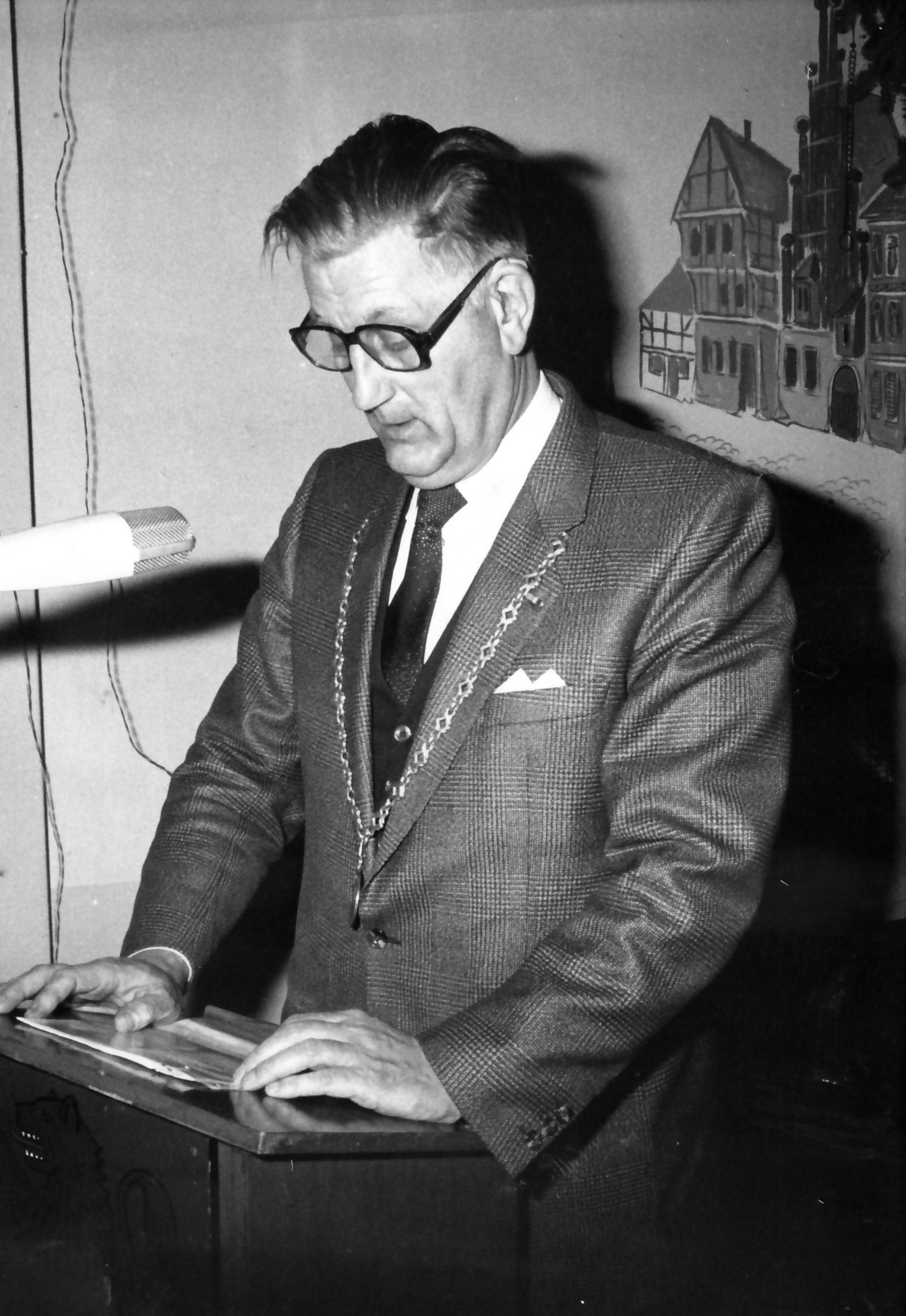 Mann mit Kette am Mikrofon, im Hintergrund ein Bild an der Wand