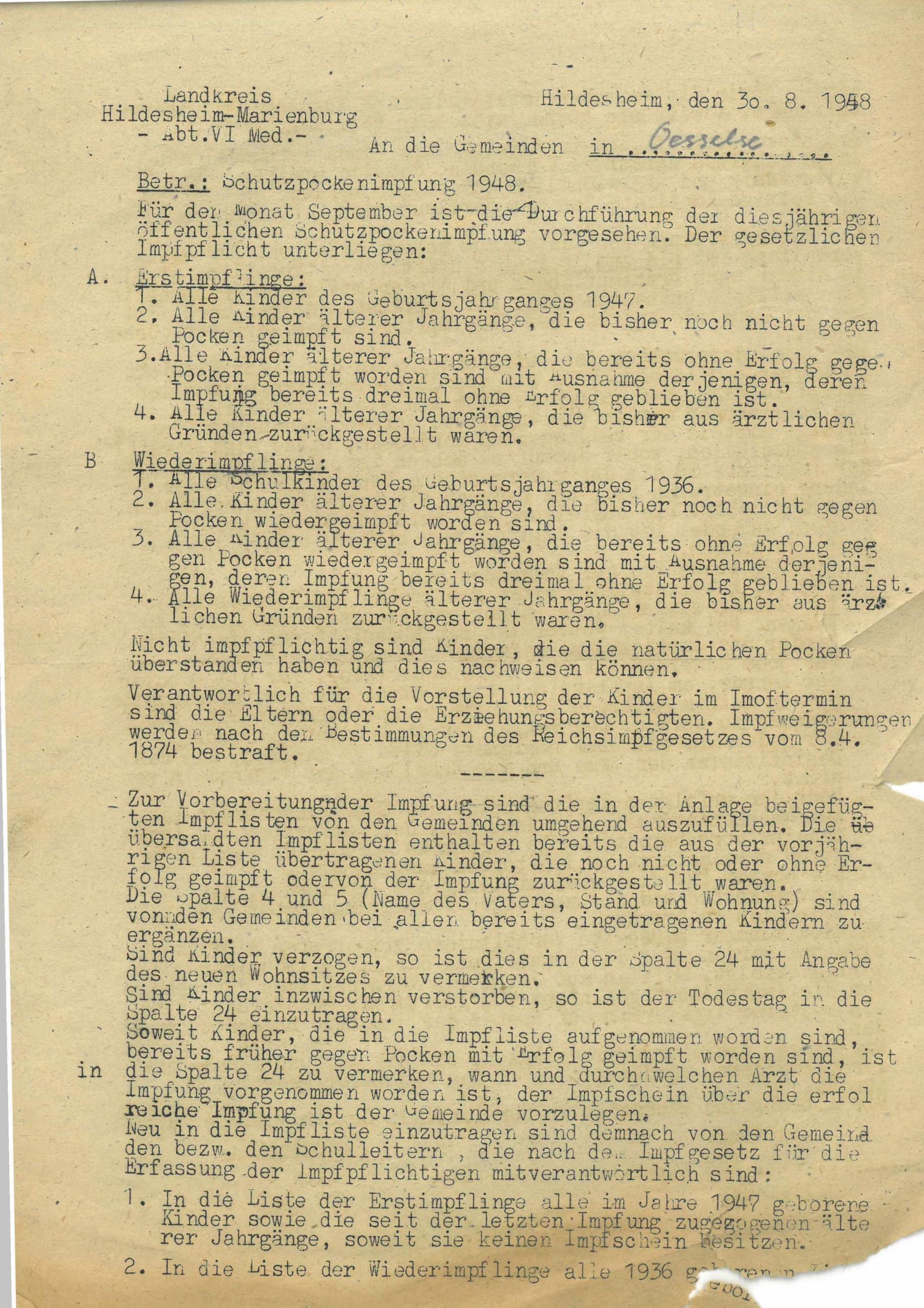Die Pocken-Impfpflicht galt auch 1948 noch. In einem Schreiben informierte das Gesundheitsamt des Landkreises Hildesheim-Marienburg am 30.8.1948 die Gemeinde Oesselse über die Durchführung der diesjährigen öffentlichen Schutzpockenimpfung. Der Impfpflicht unterlagen Kinder im Alter von einem und zwölf Jahren. Demnach waren 1948 die sog. „Erstimpflinge“ aus dem Jahrgang 1947 und die „Wiederimpflinge“ aus dem Geburtsjahrgang 1936 dran. Genesene Kinder, die die natürlichen Pocken überstanden hatten, waren nicht impfpflichtig, mussten dies aber nachweisen. Verantwortlich für die Vorstellung der Kinder beim Impftermin waren die Eltern oder die Erziehungsberechtigten. Bei Nichtantreten folgten Konsequenzen: „Impfweigerungen werden nach den Bestimmungen des Reichsimpfgesetzes vom 8.4.1874 mit Geldstrafe bis zu fünfzig Reichsmark oder mit Haft bis zu drei Tagen bestraft.“ Zur Vorbereitung der Impfung sollte die Gemeinde Oesselse Impflisten ausfüllen. Am Impftermin mussten der Gemeindedirektor und ein Lehrer teilnehmen. Der Gemeindedirektor hatte „für Aufrechterhaltung der Ruhe und Ordnung zu sorgen.“ Die Impfung wurde schließlich am 17.9.1948 durchgeführt. Rund 20 Jahre später begann die Weltgesundheitsorganisation eine Kampagne gegen die Ausrottung der Pocken. Weltweit wurden 2,4 Milliarden Impfdosen verabreicht. Die Kampagne gilt als eine der größten Erfolge der ganzen Medizingeschichte. Noch nie zuvor war es gelungen, eine Krankheit komplett auszurotten. 1972 ereignete sich in Hannover der letzte Pocken-Fall in Deutschland. 1980 erklärt die Weltgesundheitsorganisation die Pocken als offiziell ausgerottet, daraufhin wurde die weltweite Impfpflicht aufgehoben.